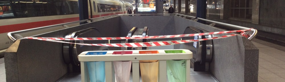 Die internationalen Gleise für die Schnellzüge nach Paris, London, Amsterdam und Frankfurt sind durch provisorische Sperren abgeschirmt. Eigenartig ruhig ist dieser abgekapselte Raum nun in diesem ansonsten so quirligen Bahnhof. Der wartende ICE öffnet erst wenige Minuten vor Abfahrt seine Türen. Das gibt dann Gelegenheit, noch eine Brüsseler Sperre mit ganz besonderer Ästhetik zu entdecken.