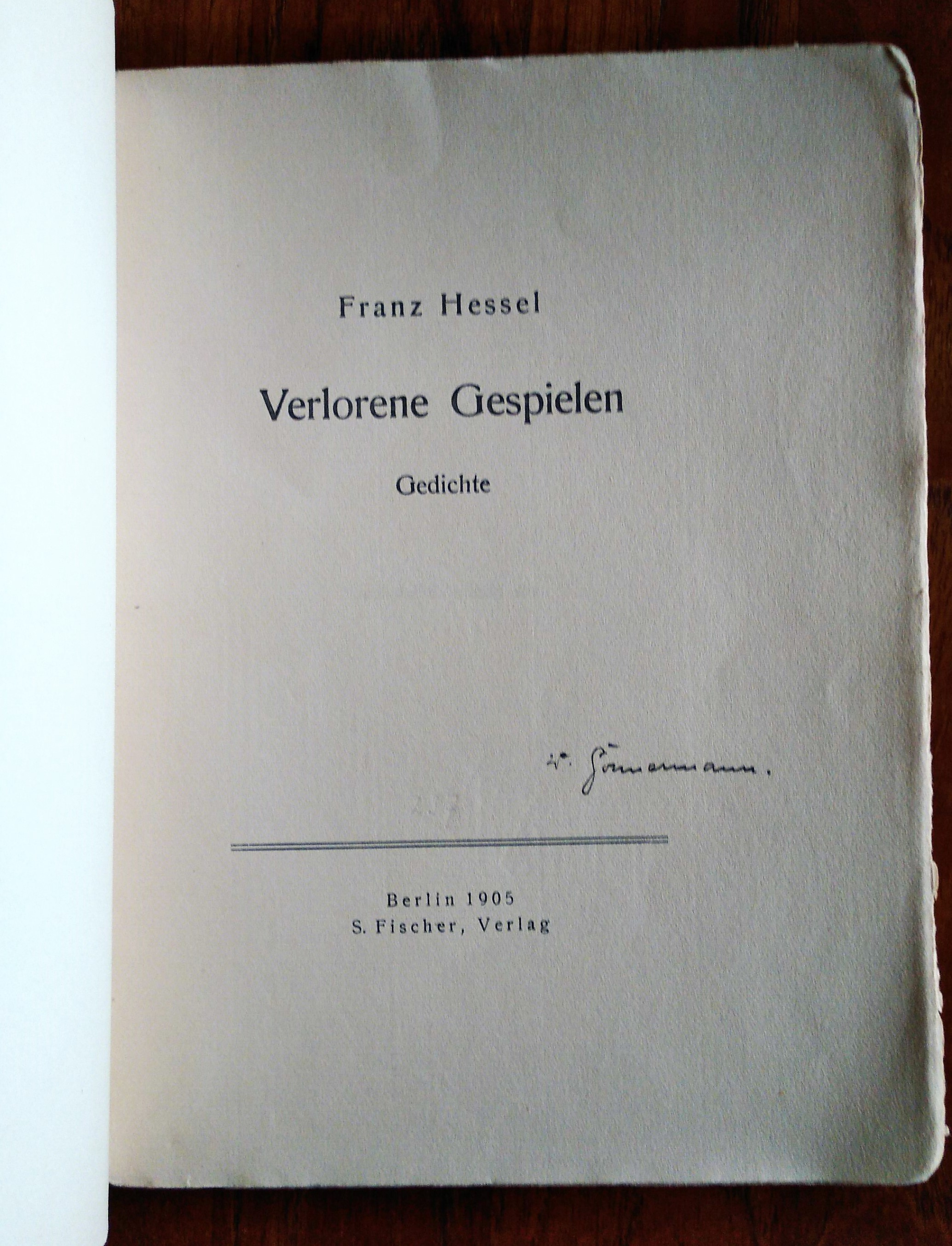 IMG_20190504_1554474 Published Mai 4, 2019 at 2070 × 2709 in 100 Raritäten (1): „Verlorene Gespielen“ von Franz Hessel Titelseite mit Namenszug des unbekannten Vorbesitzers.