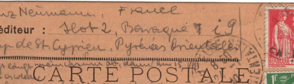 Im April 2019 erwarb ich eine Postkarte aus dem südfranzösischen Camp de St. Cyprien, am 21. Juli 1940 in deutscher Sprache eng beschrieben von einem Franz Neumann („Ilot 2, Baraque i9“) und adressiert an Walther Eckstein in New York City. Frankiert mit Briefmarken der französischen Republik, die nur wenige Wochen zuvor, am 22. Juni 1940, vor der deutschen Wehrmacht kapituliert hatte.