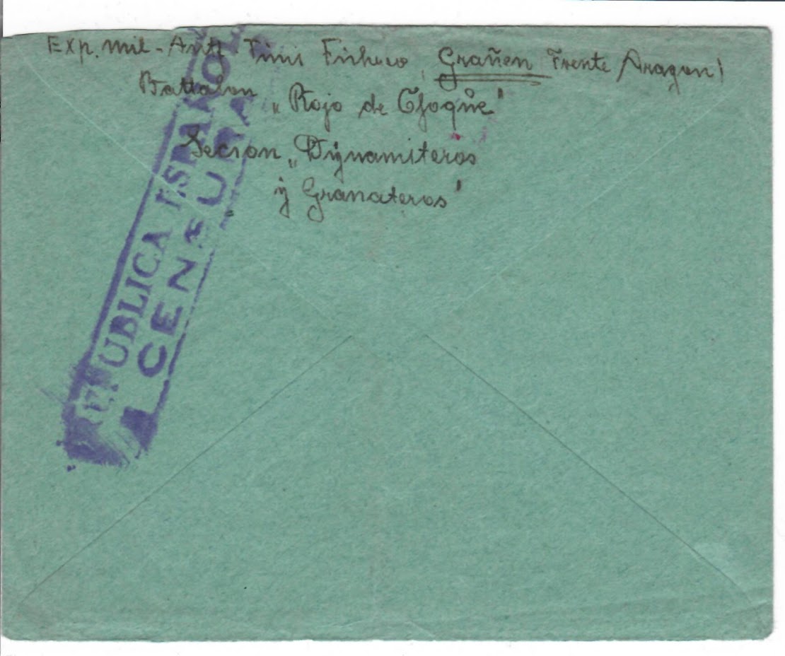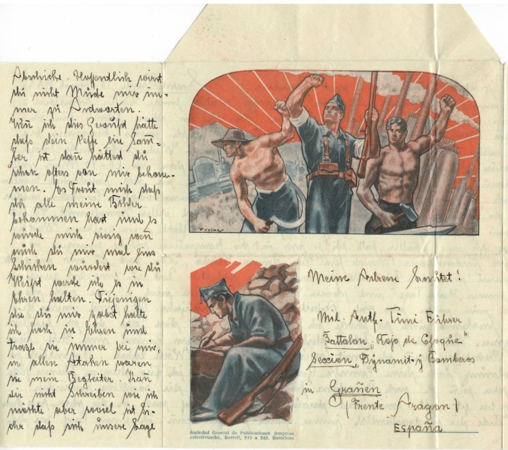 Da ich nun ein wenig Zeit habe, muss ich Dir nun wieder einige Zeilen schreiben, damit Du siehst, dass ich auch hier Deiner gedenke. Wie ich Dir schon schrieb, bin ich nun wieder seit einem Monat an der Front und bin [?], dass ich wieder heraußen bin, man fühlt sich hier wohler, na Du kennst ja mein Temperament. Werde nicht mehr lange hier in diesem Batallón bleiben, gehe in ein Alpen-Regiment, in dem ich 60-80 Mann gute Scharfschützen organisieren will. Bei uns ist alles in Ordnung und an den sämtlichen Fronten sind wir nun siegreich. Bei uns heißt es „No pasarán“ und die internationalen Faschisten werden sich hier in Spanien ihr Grab graben. Bei uns ist alles gut und [wir] sind voller Kampfesmut.