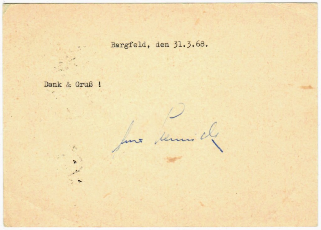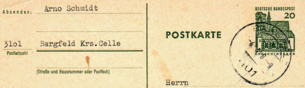 Umso erfreuter war ich, dass ich für einen akzeptablen Preis vor einigen Jahren eine von Arno Schmidt wohl an einen Leser versandte Postkarte ersteigern konnte. Erstaunlich, dass Schmidt überhaupt Leserpost beantwortete. Herzallerliebst jedoch, wie er es tat: maximal kurz und knapp. Kein Zeichen zu viel. Nur keine Freundlichkeiten.