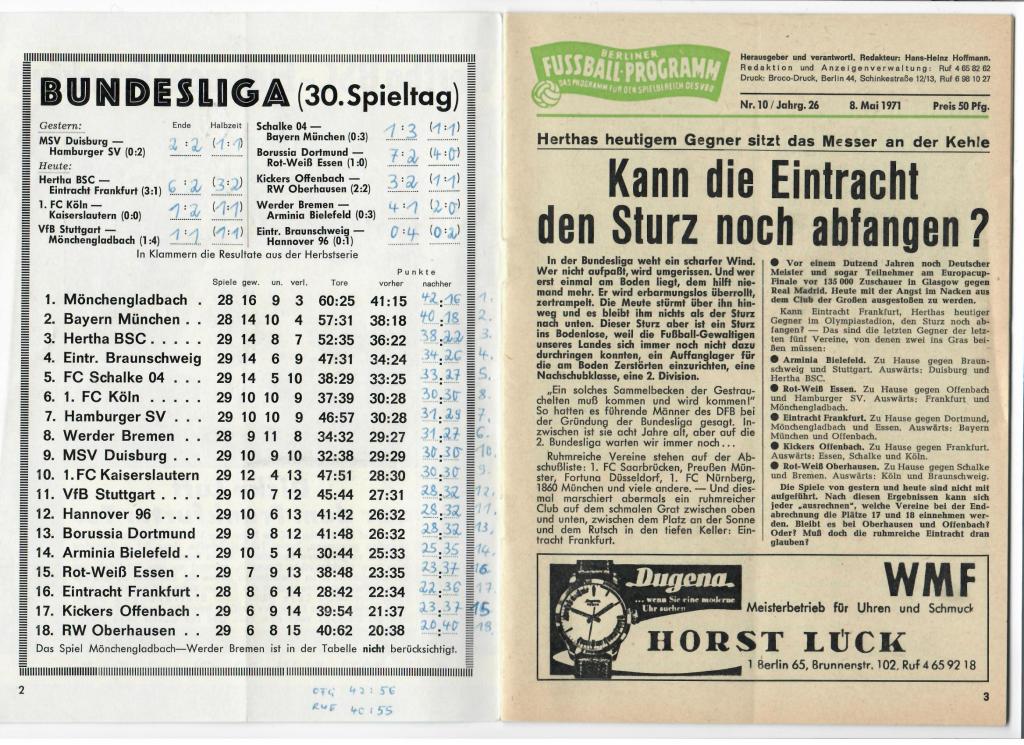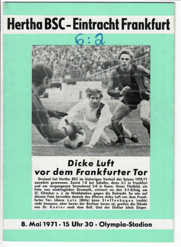 Einige Wochen nach meinem sechsten Geburtstag durfte ich dann meinen Vater, einen leidenschaftlichen Anhänger des Hamburger SV, erstmals ins Stadion begleiten. Es war eben jener 8. Mai 1971, der 30. Spieltag der achten Bundesliga-Saison. Während Hertha BSC noch Meister werden konnte, kämpfte Eintracht Frankfurt gegen den Abstieg. Doch das lernte ich erst viel später. Vermutlich war mir bis zu diesem Spiel sowohl die Existenz der Stadt Frankfurt als auch die des Vereins Eintracht gar nicht bekannt.