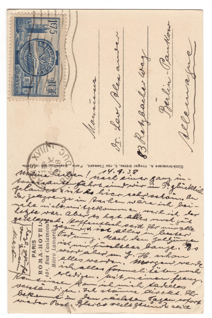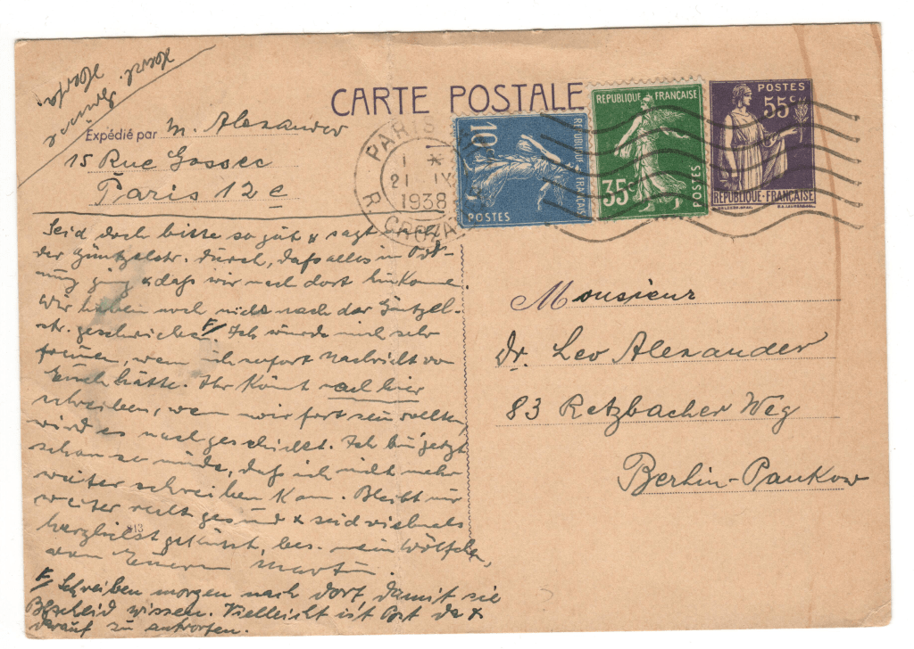 Im September 1938 emigrierte Martin Alexander in Begleitung seiner Frau (?) Herta aus Berlin nach Paris, um von dort aus weiter nach Argentinien auszuwandern. In zwei Postkarten an den Berliner Arzt Dr. Leo Alexander berichtet er aus den ersten Tagen seiner Emigration. Während Martin und Herta die Flucht vermutlich gelang, werden Leo, seine Frau Edith und der von ihnen angenommene Pflegesohn Wolfgang am 17. Mai 1943 nach Auschwitz deportiert und dort ermordet.