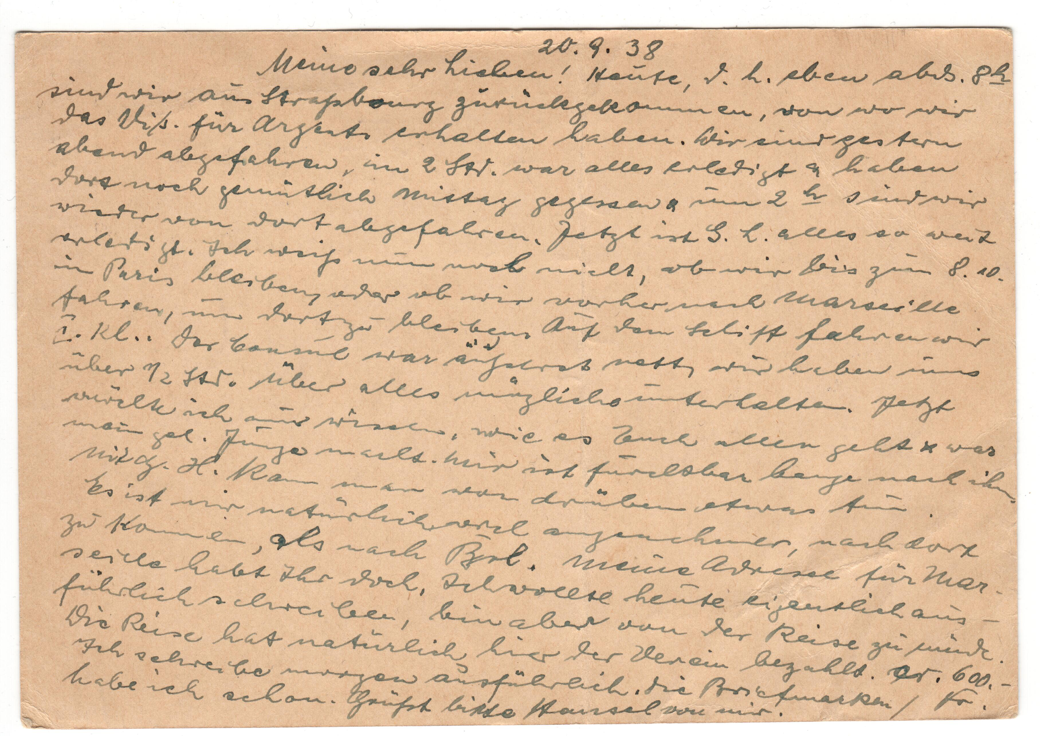 Meine sehr Lieben! Heute, d.h. eben abds. 8h sind wir aus Straßburg zurückgekommen, von wo wir das Visum für Argent. erhalten haben. Wir sind gestern abend abgefahren, in 2 Std. war alles erledigt & haben dort noch gemütlich Mittag gegessen & und um 2h sind wir wieder von dort abgefahren. Jetzt ist G. L. alles so weit erledigt. Ich weiß nun noch nicht , ob wir bis zum 8.10. in Paris bleiben, oder ob wir vorher nach Marseille fahren, um dort zu bleiben. Auf dem Schiff fahren wir I. Kl.. Der Consul war äußerst nett, wir haben uns über eine 1/2 Std. über alles mögliche unterhalten. Jetzt möchte ich nur wissen, wie es Euch allen geht & was mein gel. Junge macht. Mir ist furchtbar bange nach ihm. Mit G. H. kann man von drüben etwas tun. Es ist mir natürlich viel angenehmer, nach dort zu kommenals nach Brl. Meine Adresse für Marseille habt Ihr doch. Ich wollte heute eigentlich ausführlich schreiben, bin aber von der Reise zu müde. Die Reise hat natürlich hier der Verein bezahlt. [unleserlich] 600,- Fr. Ich schreibe morgen ausführlich. Die Briefmarken habe ich schon. Grüßt bitte Hansel [?] von mir. Seid doch bitte so gut & sagt nach der Güntzelstr. durch, daß alles in Ordnung ging & daß wir nach dort hinkommen. Wir haben noch nicht nach der Güntzelstr. geschrieben. Schreiben morgen nach dort, damit sie Bescheid wissen. Vielleicht ist Post da & darauf zu antworten. Ich würde mich sehr freuen, wenn ich sofort Nachricht von Euch hätte. Ihr könnt nach hier schreiben, wenn wir fort sein sollten, wird es nachgeschickt. Ich bin jetzt schon so müde, daß ich nicht mehr weiterschreiben kann. Bleibt nur weiter recht gesund & seid vielmals herzlichst geküsst, bes. mein Wölfchen, von Eurem Martin.