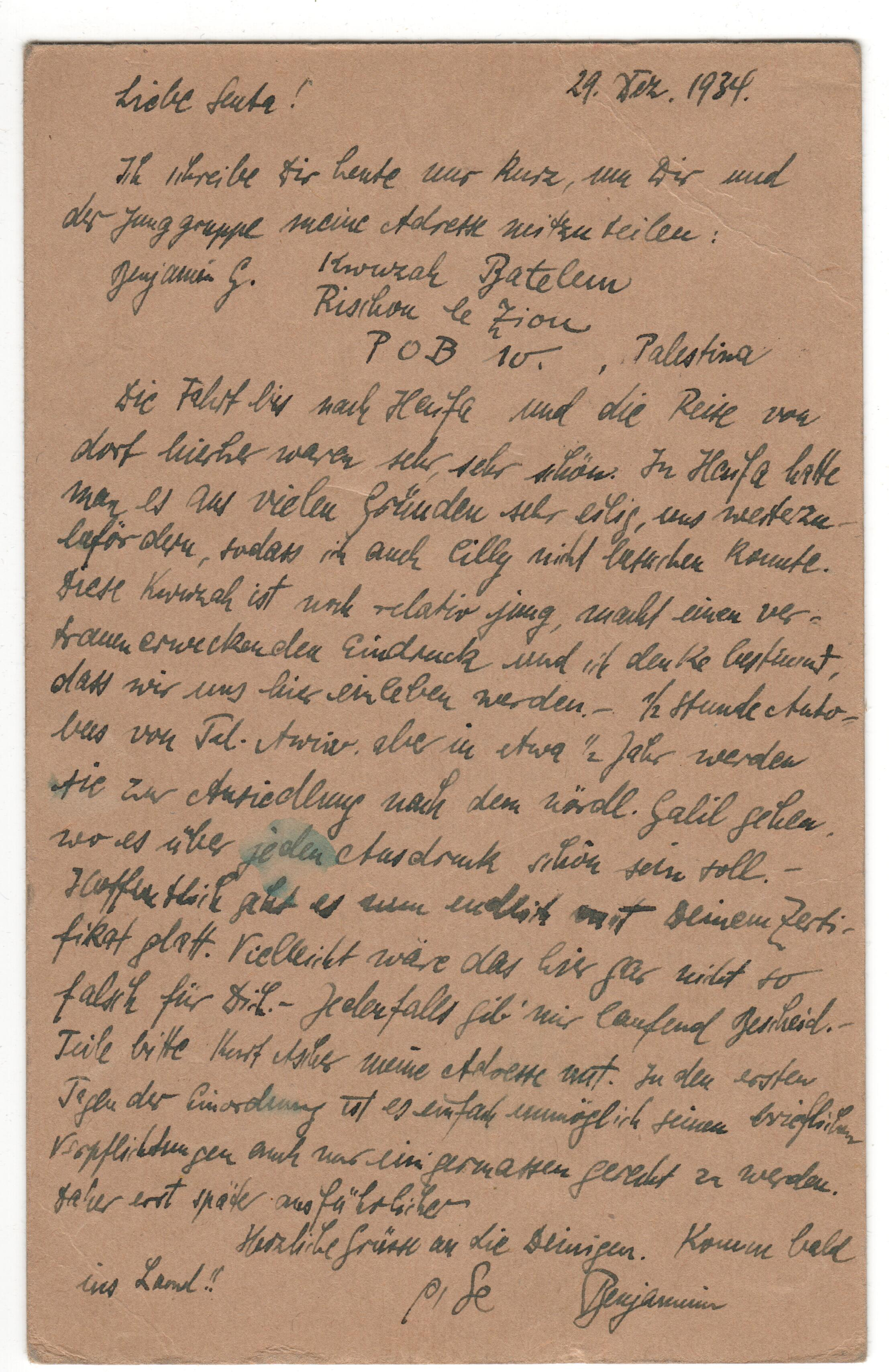 Meine Recherche nach Absender und Empfängerin der Postkarte bringt leider nur wenige Ergebnisse. Das Berliner Adressbuch des Jahres 1934 weist etwa 250 Einträge für den Nachnamen Goldschmidt aus, es gibt jedoch keinen Eintrag für Benjamin Goldschmidt. Sehr wahrscheinlich wird der junge Benjamin noch bei seinen Eltern gewohnt haben, so dass ich ihn keiner Familie zuordnen kann. Aus dem Text ergeben sich einige Hinweise. Benjamin Goldschmidt war Mitglied einer Berliner jüdischen Junggruppe, die vermutlich Jugendliche auf die Alija vorbereitete. Der Schreibstil und das Handschriftenbild wirken durchaus erwachsen, der Text ist frei von Rechtschreibfehlern – es ist gut möglich, dass Benjamin Goldschmidt vielleicht Lehrer oder Ausbilder der Junggruppe war. Internet-Recherchen liefern einige Ergebnisse zu Personen mit dem Namen Benjamin Goldschmidt, jedoch keine, die zum Absender passen könnte.