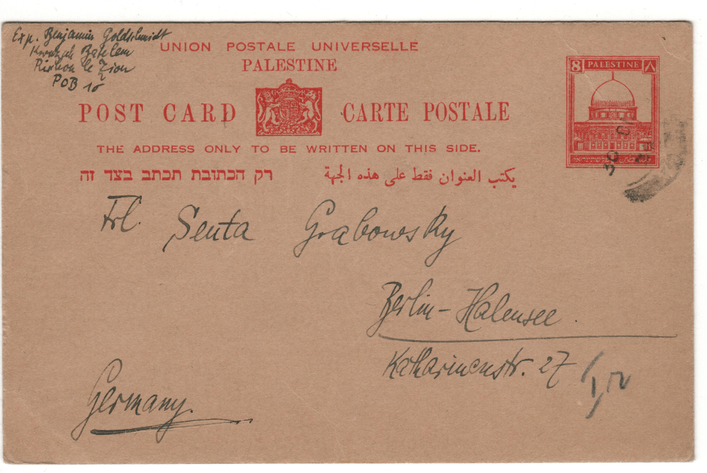 In diesem Beitrag zeige ich eine kürzlich erworbene Postkarte, die Benjamin Goldschmidt aus Palästina an Frl. Senta Grabowsky, Berlin-Halensee, Katharinenstraße 27, Germany sandte. Die Postkarte trägt das Datum vom 29. Dezember 1934. – Benjamin Goldschmidt schreibt: